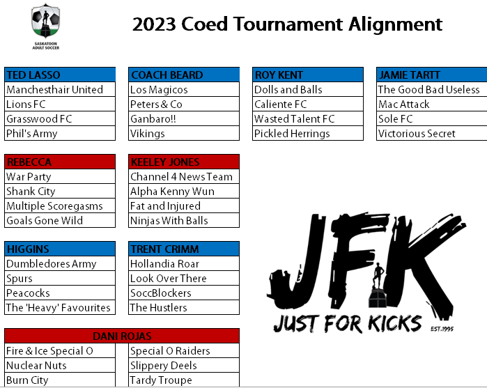 Alignment for the 2023 Just For Kicks Coed Tournament!
